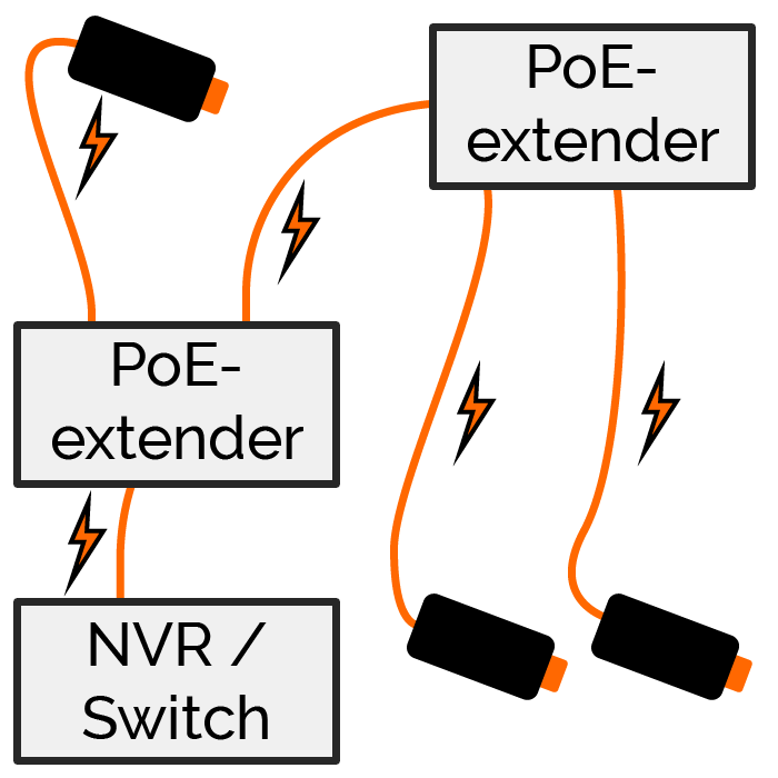 En PoE-extender med dubbla utgångar fungerar lite som en switch och gör att det går att hantera två anslutningar på en matningskabel. Detta underlättar vid kabeldragning då mindre kabel behövs och det inbyggda väderskyddet gör att anslutningarna kan göras även utomhus. Om enheterna kedjekopplas kan upp till tre kameror anslutas på en enda PoE-matad kabel.